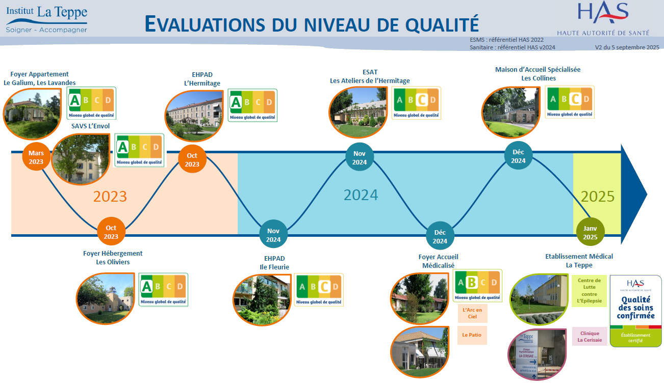 Les 8 Établissements médico-sociaux de la Teppe ont réalisé leurs visites d’évaluation entre 2023 et 2024 :