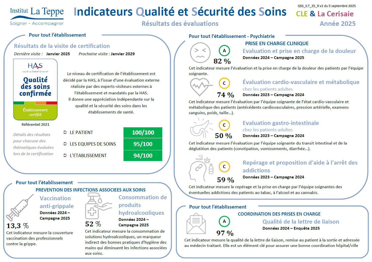 À la suite de la visite de Certification en janvier 2025, L’Établissement Médical La Teppe, regroupant le Centre de Lutte contre l’Épilepsie - CLÉ et la clinique de La Cerisaie, a reçu en avril 2025 de la Haute Autorité de Santé la mention « Qualité des soins confirmée », permettant d’être certifié.